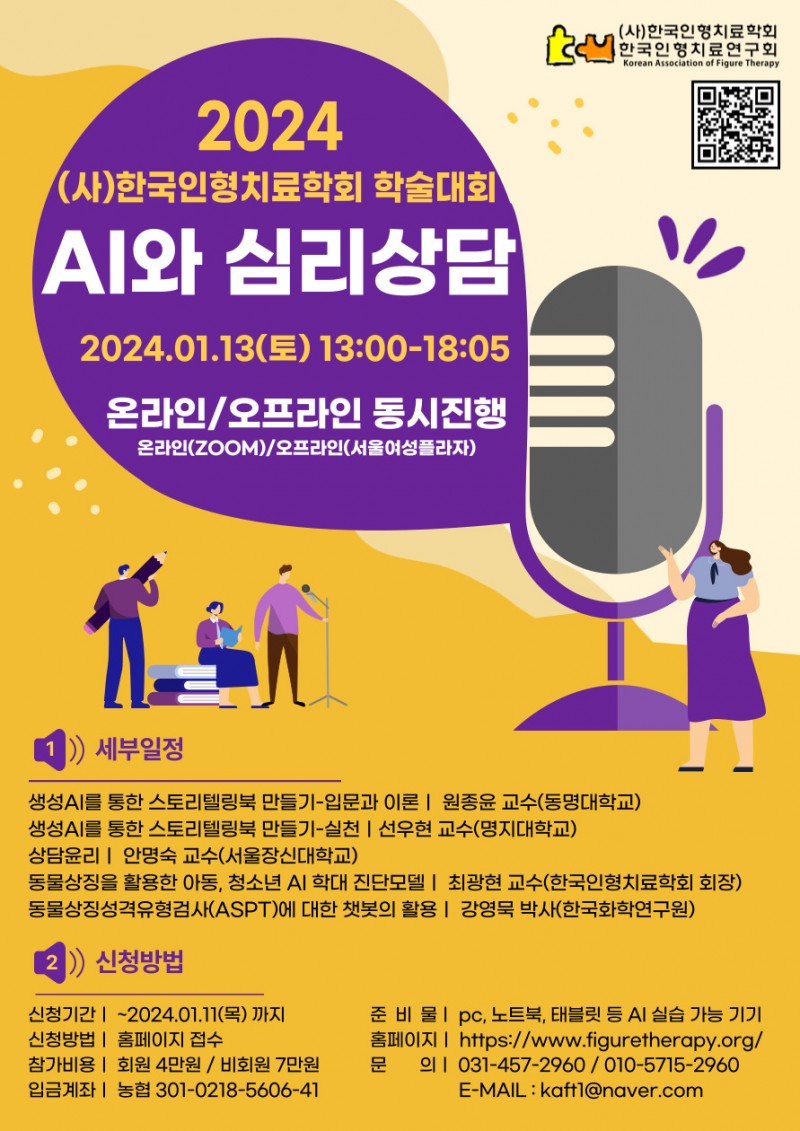2. 신청방법 : 한국인형치료학회(http://www.figuretherapy.org/) *홈페이지 로그인 > (사)한국인형치료학회 > 워크숍/학술대회 접수 > 입금 3. 신청시 유의사항 1) 이번 학술워크숍은 대면/비대면 두 가지 참여방식 중 하나를 선택해주셔야 합니다. ▶대면 참여 희망자 : 홈페이지 접수 및 입금 후, 문자 또는 메일로 "본명, 생년월일, 대면" 이라고 남겨주셔야 합니다. (단, 공간상의 이유로 대면 참여는 인원이 제한될 수 있으며 인원이 초과된 경우 해당자에게 개별연락 및 공지 예정입니다.) ▶비대면 참여 희망자 : 홈페이지 접수 및 입금 2) 학술대회와 관련된 모든 안내사항은 홈페이지 상에 입력되어 있는 메일과 문자로 안내됩니다. 반드시 접수 전에 마이페이지에서 메일주소와 연락처가 정확한지 확인하신 후 접수부탁드립니다.