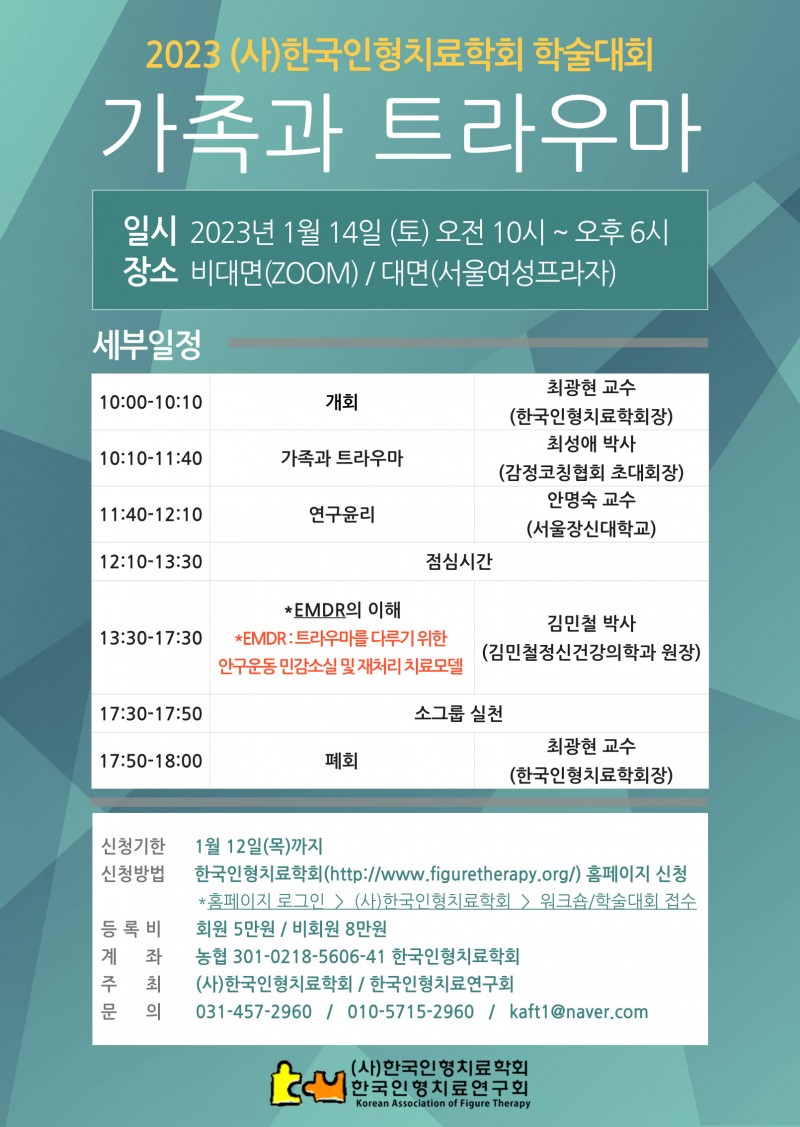 | 제목 | 2023년 (사)한국인형치료학회 학술대회 『가족과 트라우마』 |