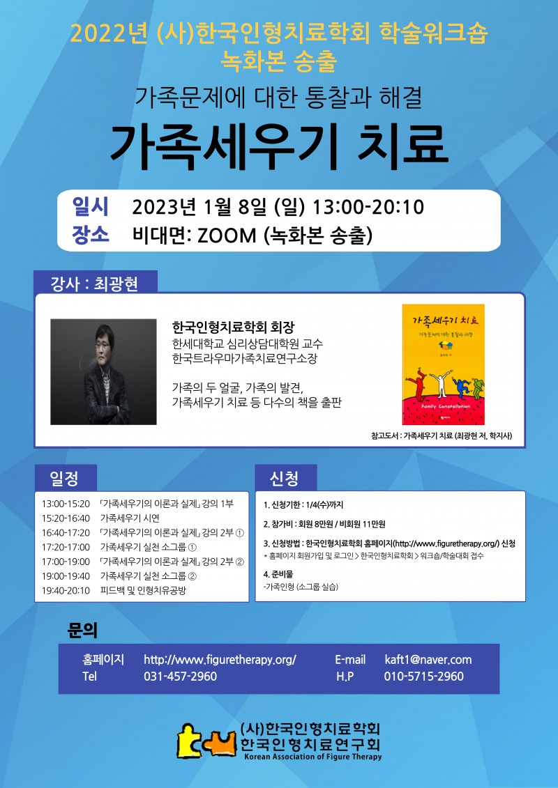 | 제목 | 2022년 (사)한국인형치료학회 학술워크숍 -가족문제에 대한 통찰과 해결『가족세우기 치료』- 녹화본 4차 재송출 |