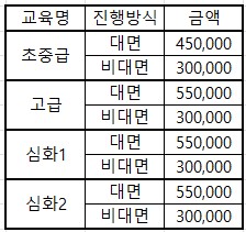 ★아래 공지된 교육비용은 비대면 진행을 고려하여 책정된 금액이며, 과거 진행되었던 대면교육의 교육비용에 비해 저렴할 수 있음을 안내드립니다. 이후 대면교육으로 진행될 경우 교육비용이 달라질 수 있습니다.