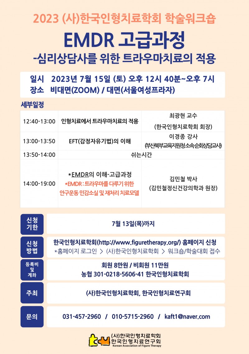 | 제목 | 2023년 (사)한국인형치료학회 학술워크숍 『EMDR고급과정 - 심리상담사를 위한 트라우마치료의 적용』 |
